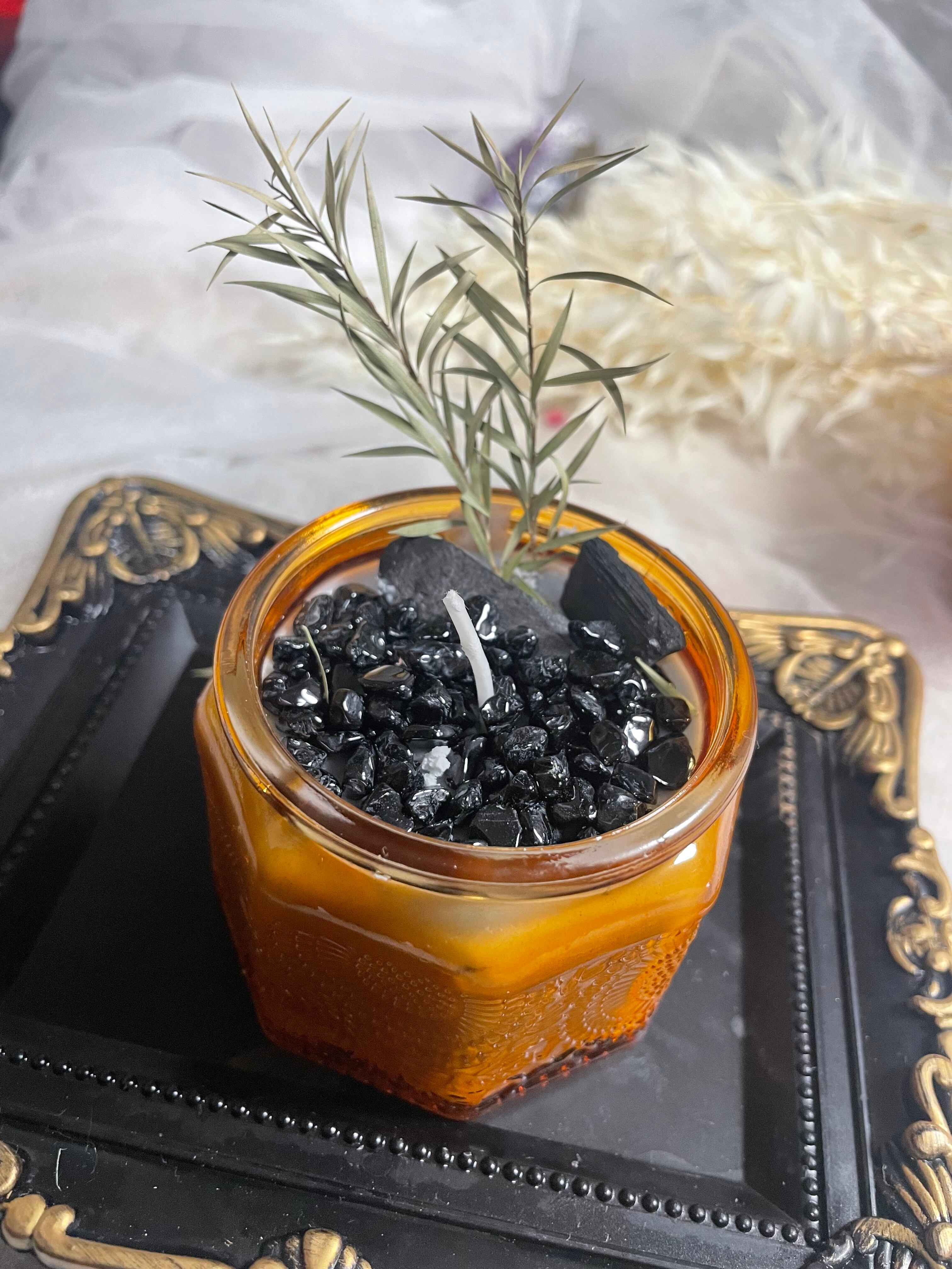 このキャンドルは、ブラックスピネルと備長炭を使用した特別なデザインです。ブラックスピネルの美しい輝きが目を引き、備長炭が持つ特有の香りが広がります。